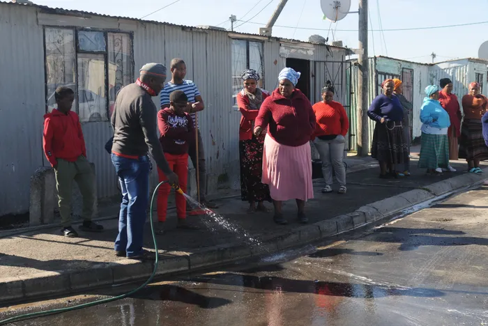 Relatives of the deceased clean blood from the street after another mass shooting in Khayelitsha. It is believed that more than 60 bullets had been fired in the incident which claimed the lives of six men.