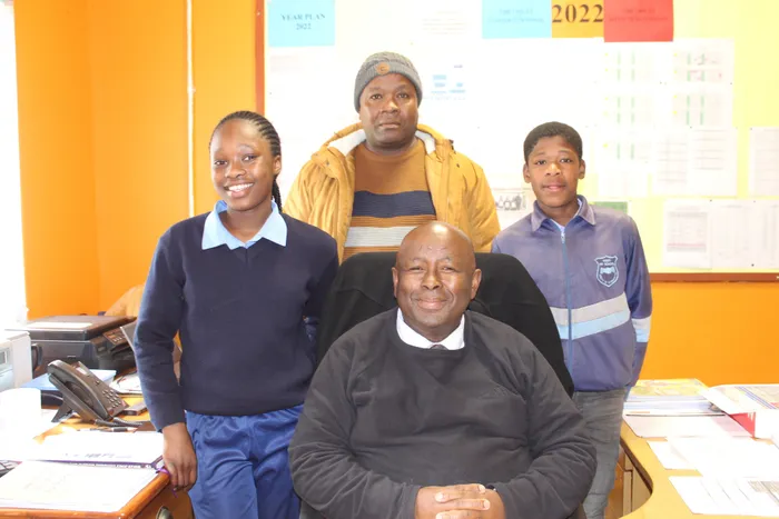Pupils Mbali Jamela, left, and Anga Ncisa with teacher Zola Mqoboka and principal Philani Marhubelela, seated.