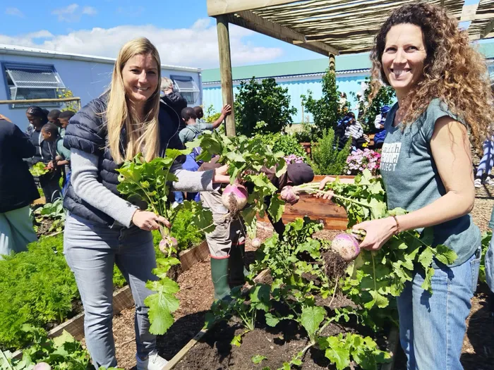 Chrsitine Marhofer, right, of the garden's founders, together with director of Earthchild Garden Janna Kretzma, showing some of the harvest from the garden.