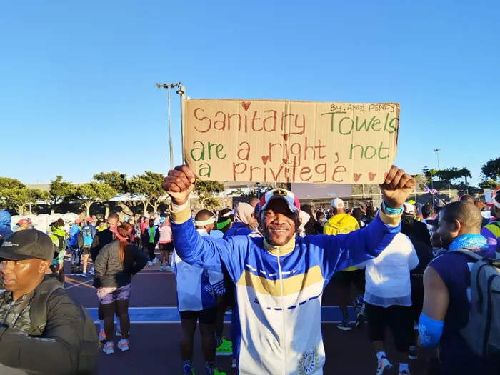 On Sunday, October 19, Mr Zaleni was set to complete a full 42.2km in the Cape Town Marathon, proudly carrying a handwritten placard that read: “Sanitary towels are a right, not a privilege.”