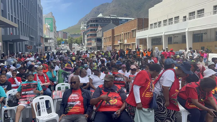 Hundreds of People Against Budget Cuts sit across from parliament, in Cape Town.