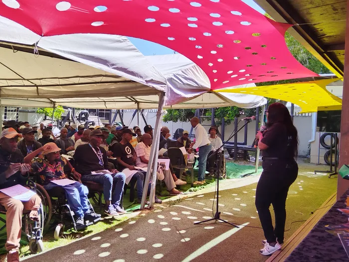 Director of eTafeni Nontombi Buthelezi addressing the men who attended the dialogue, urging them to change their community to create a safe space for all.