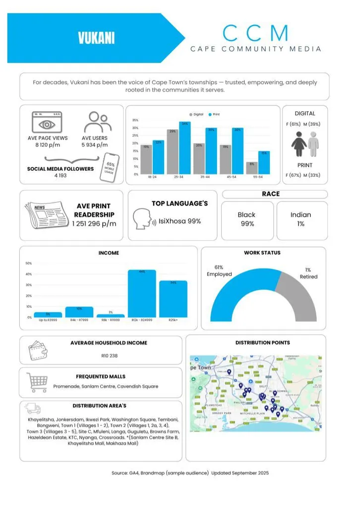The Vukani is a free weekly community newspaper available in print and digital format, and is distributed to 81 250 readers’ homes every Thursday in the Khayelitsha, Jonkersdam, lkwezi Park, Washington Square, Tembani, Bongweni, Town 1 (Villages I – 2), Town 2 (Villages 1, 2a, 3, 4), Town 3 (Villages 3 – 5), Site C, Mfuleni, Langa, Guguletu, Browns Form, Hazeldean Estate, KTC, Nyanga and Crossroads areas.